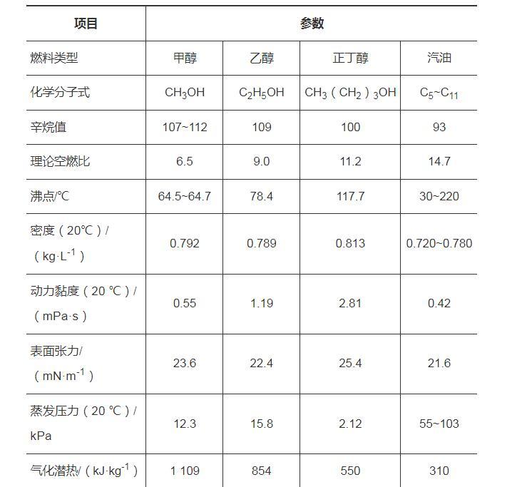 试验燃料选取甲醇、乙醇和正丁醇,3种醇类燃料及汽油的基本燃料特性如表1所示。试验工况设计方案如表2所示。为了保证数据准确性和可靠性,避免试验中的随机误差,每种工况重复测试10次。
