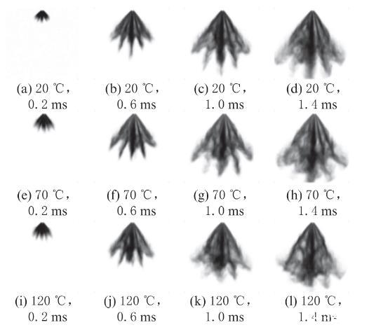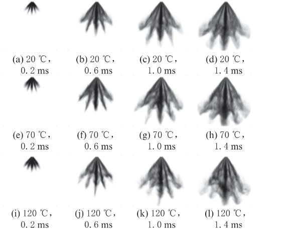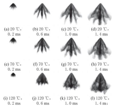 图6不同环境温度和喷雾开始后时刻下正丁醇的喷雾形态