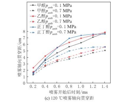 在试验中发现,高温高压的环境对喷雾形态产生了较大的改变,相比于单种工况,环境温度和背压共同对喷雾形态有着更复杂的影响。图8为3种醇类燃料在不同温度(20℃、70℃、120℃)、不同背压(0.1 MPa、0.7 MPa)的环境下,喷射压力为20 MPa时的喷雾轴向贯穿距的变化。