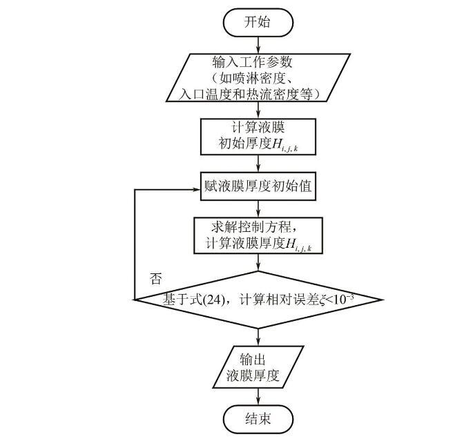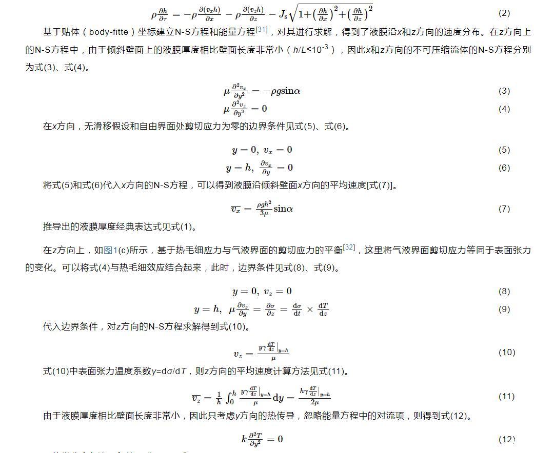 式(1)将作为本文模型计算的迭代初值。之后,Kapitza首次对倾斜平板上流动液膜的流体动力学不稳定性进行了研究,对流动液膜的流动不稳定性和破裂有了初步的认识。随着实验方法和测量技术的不断进步,研究人员通过更高效的实验和模拟方法对流动液膜进行了深入和广泛的研究,深化了对液膜流动模式、流动特性和蒸发等内在机制的理解,也为相关的工业应用提供了重要的科学依据。