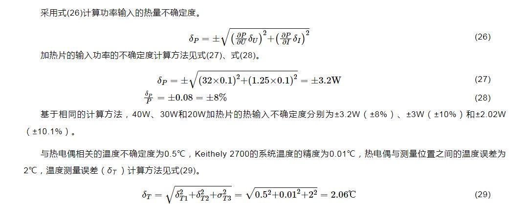基于相同的计算方法,40W、30W和20W加热片的热输入不确定度分别为±3.2W(±8%)、±3W(±10%)和±2.02W(±10.1%)。
