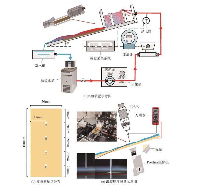 本实验的实验装置,如图3(a)所示。该装置主要由液体回路、布液器和实验段三大部分组成。液体回路用于提供不同的流动条件,以确保布液器能够稳定形成液膜。在这个回路中,液体从恒温水箱(Julabo-Vivo RT2)中流出,恒温水箱提供一个稳定的入口温度,由齿轮泵(Cole-parmer)控制液体流量大小,液体再流入流量计(Micro motion 2700,精度为±0.05%),流量计监测管道内液体的质量流量,在布液器的入口端放置一个T型热电偶(精度为±0.5℃)来测量入口温度的变化,最后使用数据采集器(Keithely 2700)采集流量计的质量流量、热电偶的温度和加热片的功率。本实验对入口温度要求较高,所以采用一些保温措施,在不锈钢管和布液器腔室周围包裹一层保温棉,减少热量损失。