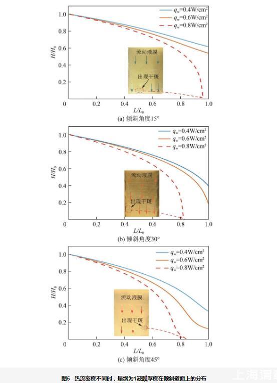 图5所示的数学模型中,壁面倾斜角度分别为15°、30°和45°,喷淋密度为0.016kg/(m·s)、0.03kg/(m·s)和0.04kg/(m·s),入口温度为70℃。通过施加不同的热流密度加热壁面,模型计算得出了量纲为1液膜厚度在倾斜壁面上的分布情况。结果显示,当热流密度qw=0.8W/cm2时,不同倾斜角度下的壁面上量纲为1液膜厚度均逐渐减小,最终降至零,出现了烧干现象。同时,模型计算结果与实验结果相符,干斑位置均出现在壁面底部,这一现象的产生不仅是由于蒸发的作用,还与热毛细效应密切相关。在加热过程中,热毛细效应促进了液膜表面张力的变化,使得液膜的稳定性减弱,导致液膜局部破裂。随着蒸发效应的增强,液膜厚度逐渐减小,特别是在液膜的薄弱区域,蒸发速率提高,导致液膜厚度进一步减小,最终在底部区域发生破裂。因此,干斑通常出现在壁面底部,这进一步验证了实验结果与数学模型计算之间的良好一致性,并表明所建立的数学模型能够有效预测液膜在倾斜加热壁面上的流动行为和烧干现象。