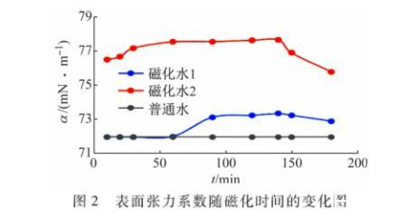(1)从图表可以看出,磁化水2在最初的前60 min内表面张力系数有了较大的变化,最大差值为7.8%