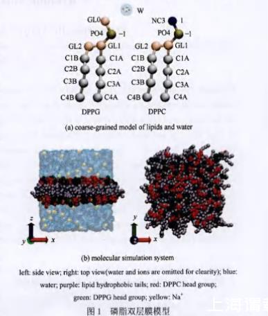 自然界的磷脂双层膜由两层磷脂单分子组装而成,是生命活动的重要载体。磷脂膜的生物相容性使得其在生物传感器、仿生纳滤膜和生物膜反应器等领域呈现良好的应用前景。阐释外力作用下磷脂膜破裂过程的规律,对于磷脂膜和基于磷脂膜的器件设计及应用具有重要的基础意义。表面张力是磷脂膜所受到的最重要外力之一,磷脂膜在高强度表面张力及其快速变化作用下会加速破裂。微管吸吮实验表明,当表面张力在(10~30)×10−5N·cm−1的范围内,磷脂囊泡就会发生破裂,磷脂囊泡破裂亦与表面张力的施加速度有关。然而磷脂膜的破裂是发生在分子尺度上的微秒级变化,尚难以直接通过实验研究磷脂膜破裂的分子机制。分子模拟为研究磷脂膜的破裂提供了有力工具。Tieleman等利用全原子分子动力学模拟发现对于纯DPPC磷脂膜,当横向的机械拉伸力大于−200×10−5Pa时,磷脂膜会发生不可逆的破裂。Groot等采用耗散粒子动力学研究了表面活性剂对张力下磷脂膜的破裂行为的影响,模拟结果显示表面活性剂的存在降低了磷脂膜的可拉伸性并且降低了磷脂膜所能承受的最大表面张力。Leontiadou等采用分子动力学的方法研究了纯DPPC膜中亲水性孔道的结构及磷脂膜的破裂,结果表明当磷脂膜的表面张力低于38×10−5N·cm−1时,膜中的亲水性孔道可以保持稳定的结构;而当表面张力大于该值时,孔道结构逐步扩大并最终导致膜的破裂。Lai等的研究表明,直径小于0.5 nm的纳米粒子有助于水分子进入磷脂双分子层并诱导磷脂膜破裂;而直径大于0.7 nm的纳米粒子则有助于稳定磷脂膜。Xie等采用分子动力学模拟展示了表面张力的施加速度对于纯DPPC磷脂膜破裂的影响。总体而言,从分子水平上揭示磷脂组成对磷脂膜破裂的影响机制以及对非恒定表面张力作用下磷脂双层膜的破裂规律的研究尚有待深入。