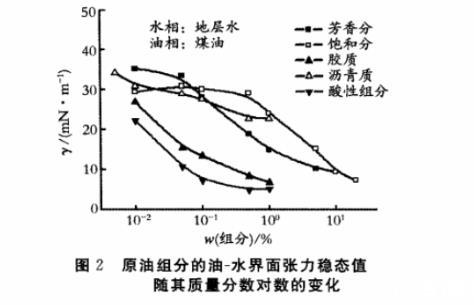 图2原油组分的油-水界面张力稳态值随其质量分数对数的变化