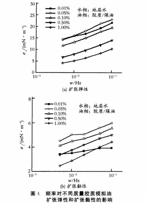 图4频率对不同质量胶质模拟油扩张弹性和扩张黏性的影响