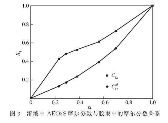 图3溶液中AEO3S摩尔分数与胶束中的摩尔分数关系
