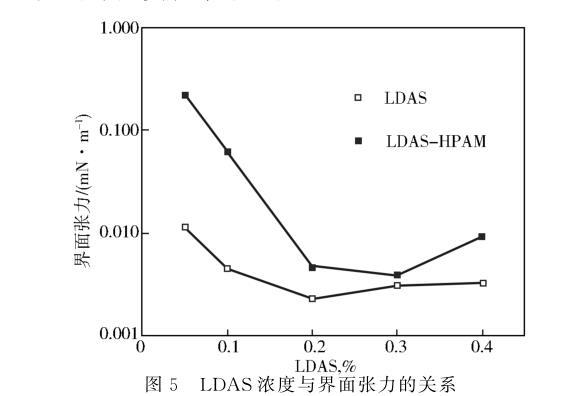 实验固定聚合物浓度0.12%HPAM,改变LDAS用量,70℃下测试驱油体系与原油之间的界面张力,实验结果见图5。