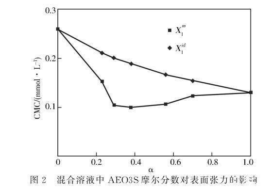 图2混合溶液中AEO3S摩尔分数对表面张力的影响