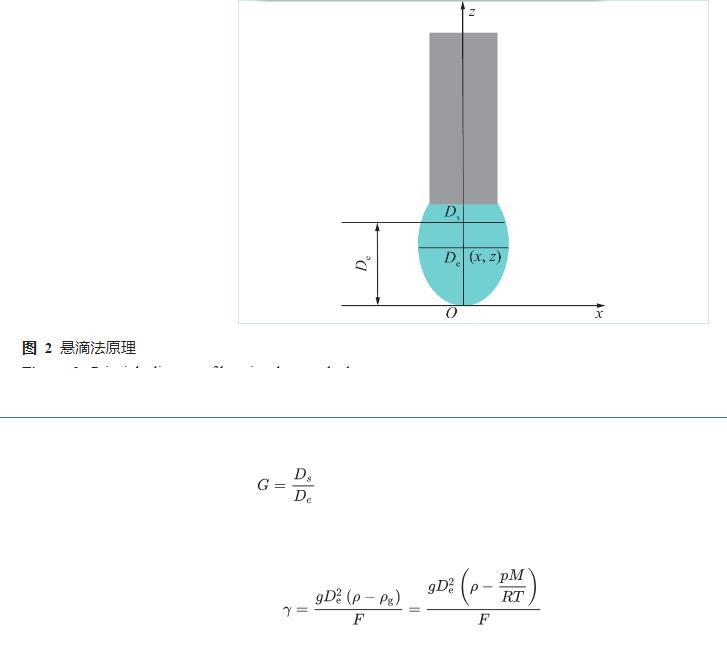 笔者采用悬滴法进行水与瓦斯之间表面张力的测试,当水滴被静止悬挂在毛细管的管口处时,液滴的外形主要取决于重力和表面张力的平衡,通过对水滴外形的测定获得水与瓦斯之间表面张力计算的相关参数。悬滴法原理图如图2所示,采用自开发的水与瓦斯之间界面张力分析软件获得式(1)中Ds、De,联合水、瓦斯的密度、修正后的形状因子(F)、重力加速度(g),基于式(2)计算水与瓦斯之间的表面张力。