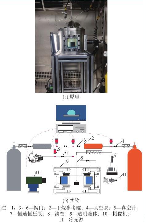 含瓦斯煤与水之间接触角测试设备具备抽真空、充气吸附、恒温控制、滴水、光学成像及自动采集数据的功能,设备的实物图及原理分别如图1a—图1b所示。