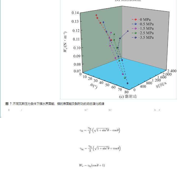 由图7a可知,同一瓦斯压力条件下,煤水界面能随着润湿时间的增加而减小,随着接触角的减小而减小。因为煤水界面能越小,水分越容易在煤体表面铺展。同一时刻,瓦斯压力越大,煤水接触角越大,煤水界面能越大,水分越不容易在煤体表面铺展;由图7b可知,同一瓦斯压力条件下,煤的表面能随着润湿时间的增加而增加,随着接触角的减小而增大。因为煤的表面能越高,越容易被水润湿。同一时刻,瓦斯压力越大,煤水接触角越大,煤的表面能越小,水分越不容易在煤体表面铺展;由图7c可知,同一瓦斯压力条件下,黏附功随润湿时间的增加而增加,随着接触角的减小而增大。黏附功越大,越容易被水润湿。同一时刻,瓦斯压力越大,煤水接触角越大,黏附功越小,水分越不容易在煤体表面铺展。因此,降低瓦斯压力及延长润湿时间有助于减小煤水界面能、增加煤的表面能及增加黏附功,进而有助于提高水对煤的润湿效果。因此,采用煤层注水措施治理瓦斯及预湿减尘时,应给予煤体充分的润湿时间。