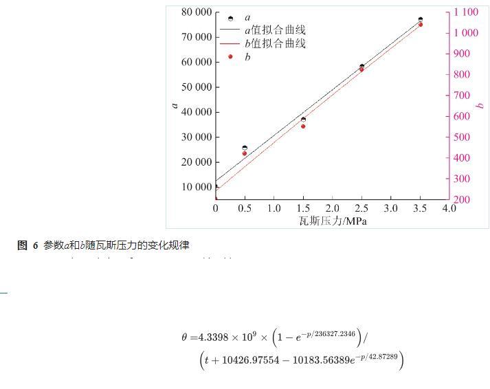 由图5可知,同一瓦斯压力下,接触角随着时间的增加而逐渐减小,说明水分在含瓦斯煤表面发生了浸润现象。接触角θ与时间t满足的关系,参数a和b的值如图6所示。参数a与压力p满足的关系,参数b与压力p满足的关系。接触角与压力及时间的关系如式(4)所示。