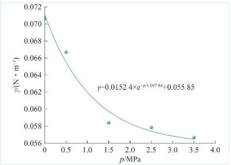 由图4可知,水与瓦斯之间的表面张力随着瓦斯压力的增加而减小,表面张力与瓦斯压力满足负指数的关系,如式(3)所示。在水与瓦斯的界面,水分子两侧分别与瓦斯分子、液体分子接触,表面分子受到的朝向液体内部的吸引力大于气体分子的吸引力。随着瓦斯压力的增加,水与瓦斯接触表面之间的密度差逐渐减小,瓦斯分子对水分子的引力逐渐变大,抑制了液体表面分子向液体内部的运动,使系统的能量趋向于平衡状态。因此,水与瓦斯之间的表面张力随着瓦斯压力的增加而减小。