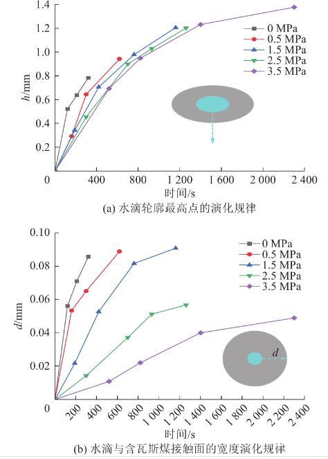 由图8可知,在一定的瓦斯压力条件下,随着时间的增加,水滴逐渐趋向于扁平,水滴与含瓦斯煤的接触面宽度逐渐增加,即润湿的宽度逐渐增加,水滴的高度逐渐减小。通过图8可以获得,不同瓦斯压力、不同时间水滴轮廓最高点的坐标,将不同瓦斯压力、不同时间水滴轮廓的最高点与不同瓦斯压力、初始时刻水滴轮廓的最高点做差,可以获得水滴轮廓最高点随时间的演化规律(图9a)。通过图8可以获得不同瓦斯压力、不同时间水滴与含瓦斯煤接触面的宽度,采用不同瓦斯压力、不同时间水滴与含瓦斯煤接触面的宽度减去不同瓦斯压力、初始时刻水滴与含瓦斯煤接触面的宽度,即可获得水滴与含瓦斯煤接触面的宽度演化规律(图9b)。