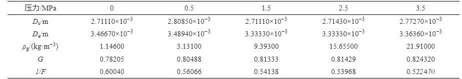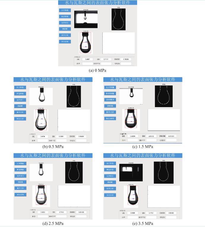 采用团队自开发的水与瓦斯之间的表面张力分析软件对不同瓦斯压力条件下的水滴形貌(图3)进行分析,即可获得式(1)中的Ds及De。F为G修正后的形状因子,F通过查表及插值法获得,式(1)中的参数见表1,将表1中的参数带入式(1)及式(2),即可获得不同瓦斯压力条件下水与瓦斯之间的表面张力(图4)。