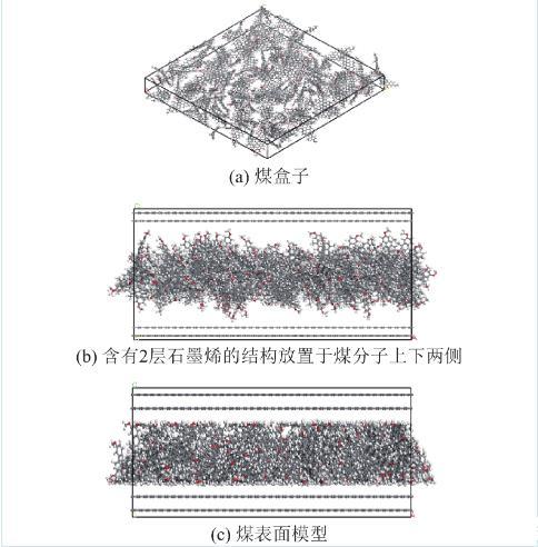 采用Materials studio分子动力学软件中的Amorphous Cell功能,建立一个由150个wender无烟煤分子组成的煤盒子(图10a),煤盒子的长和宽均为10 nm;然后创建一个与煤盒子等长/等宽的含有2层石墨烯的结构,通过Build layers功能将含有2层石墨烯的结构放置于煤分子上下两侧(图10b);最后,通过不断的压缩、移动及结构优化操作,将上下两侧的石墨烯结构删除,获得平整的煤表面模型(图10c)。