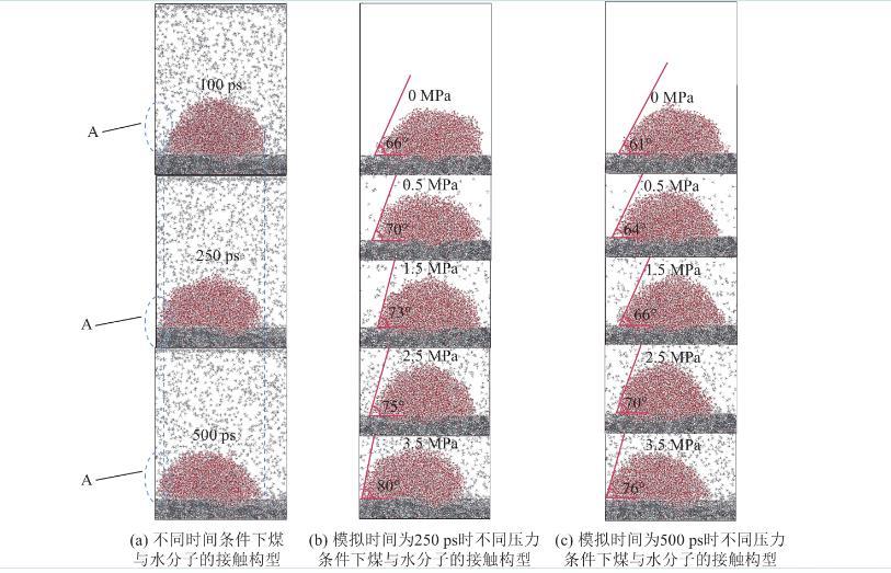 通过对比瓦斯压力为3.5 MPa条件下,模拟时间为100、250、500 ps时,煤与水分子接触构型(图13a)可以获得如下规律:随着时间的增加,水分子逐渐在煤表面铺展,接触面宽度逐渐增加,通过观察图13a中的区域A可以明显发现此规律。通过对比同一瓦斯压力、不同时间条件下,煤与水分子接触构型(图13b—图13c)发现:随着时间的增加,煤与水分子之间的接触角逐渐减小。综合分析可知,在同一瓦斯压力条件下,随着时间的增加,水分逐渐在煤体表面铺展,水与煤之间的接触角逐渐减小。通过对比同一时间条件下(图13b—图13c)可知,随着瓦斯压力的增加,煤与水分子之间的接触角逐渐增加,其原因是瓦斯压力越大,水分子越不易在煤表面铺展且不易进入煤中,水分越不容易润湿煤。