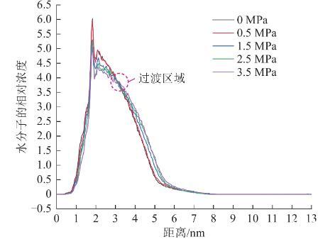 基于不同瓦斯压力条件下、动力学模拟时间为500 ps时,煤与水分子的分子动力学模拟结果,对不同瓦斯压力条件下水分子沿Z轴的相对浓度进行计算,即可获得不同瓦斯压力条件下,水分子的相对浓度(一定法向距离范围,水分子数密度与系统内水分子总数密度的比值)分布如图14所示。