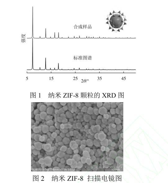 纳米ZIF-8颗粒的XRD谱图如图1所示。合成的样品谱图分布与标准谱图匹配,且所获得的衍射峰与文献吻合,未出现杂峰,表明制备的样品具有单一相且结晶度良好。由谢乐公式计算得到晶粒尺寸约为70 nm。由纳米ZIF-8颗粒的扫描电镜照片可见,ZIF-8颗粒形貌为六边形,平均尺寸为65.8 nm,与XRD计算结果一致。