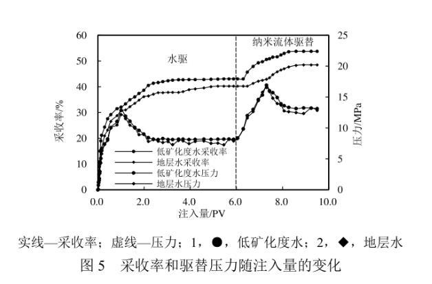 在驱油机理实验探究的基础上,优选纳米ZIF-8颗粒质量分数为0.03%的纳米流体进行岩心驱替实验。采收率及驱替压力随注入体积的变化如图5所示。使用模拟地层水、低矿化度水首次驱替至无油产出时的采收率分别为40.24%、43.06%。转注含纳米ZIF-8颗粒的流体后,受益于岩石表面润湿性向着更加水湿转变以及油水间界面张力的降低,油滴更易被剥落,且在流动过程中更易被注入液包裹形成乳状液,增强了微观驱替效率,从而使得最终采收率分别提高了8.25百分点和10.71百分点。注入纳米流体后,驱替压力得到了一定的提升。这可能是由于纳米颗粒堵住了部分高渗通道,流体向孔渗条件较差的小孔隙流动,从而提高了波及效率,在一定程度上也有助于采收率的提高。