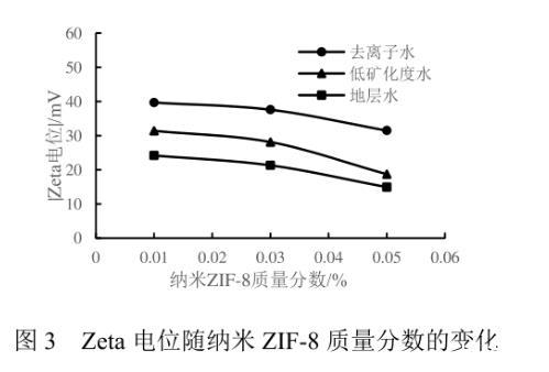 纳米ZIF-8流体的稳定性是评价其能否作为驱油剂的重要性质之一。将装有不同浓度纳米流体的样品瓶静置15 d后,当ZIF-8的质量分数为0.01%、0.03%时,纳米颗粒在不同矿化度的流体中均保持稳定状态,无沉淀生成,说明适当浓度的纳米ZIF-8颗粒在水中有着良好的稳定性。当ZIF-8的质量分数为0.05%时,静置后的纳米流体产生了少量沉淀,表明过高浓度的ZIF-8会互相聚结,导致颗粒变大,进而发生聚沉。