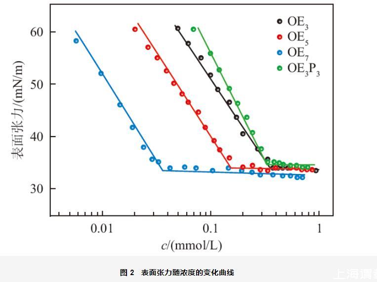 OEn水溶液的表面张力随浓度的变化曲线如图2所示。从图中可以看出,随着OEn浓度的增加,其表面张力都逐渐降低,当浓度达到cmc时,表面张力不再变化,说明其在体相内已经形成了聚集体。由表面张力曲线得到OEn的表面活性参数如表1所示。OE3、OE5、OE7的γcmc分别为34.17,33.91和33.79 mN/m,由于这三种表面活性剂的分子仅相差2个EO基团,整体结构相差不大,因此它们的γcmc相差不大。OE3、OE5、OE7的cmc分别为0.32,0.19和0.036 mmol/L,其cmc值随着分子中EO基团数目的增多而减小,Jin等将EO基团对表面活性剂溶液的这种影响归因于EO基团在分子中起疏水基的作用。Ivanova等人报道了C10E3的cmc为0.46 mmol/L,稍高于本文中OE3的cmc值,这是因为OE3具有较长的烷基链,其疏水性高于C10E3所致。通过上述分析发现,EO加合数对OEn的cmc影响要明显高于对γcmc的影响。