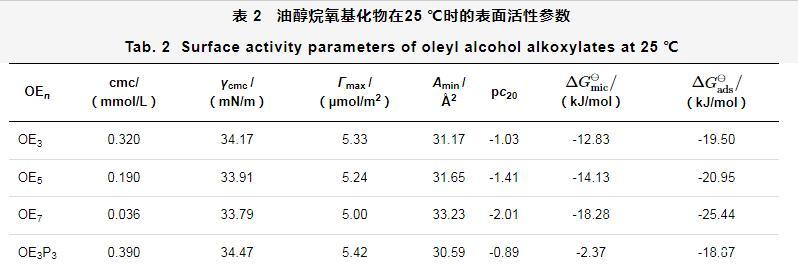 表2油醇烷氧基化物在25℃时的表面活性参数