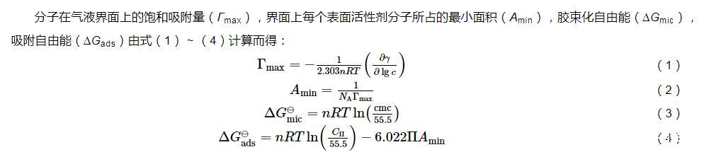 分子在气液界面上的饱和吸附量(Γmax),界面上每个表面活性剂分子所占的最小面积(Amin),胶束化自由能(?Gmic),吸附自由能(?Gads)由式(1)~(4)计算而得:
