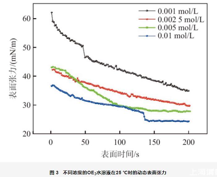 图3不同浓度的OE3水溶液在25℃时的动态表面张力