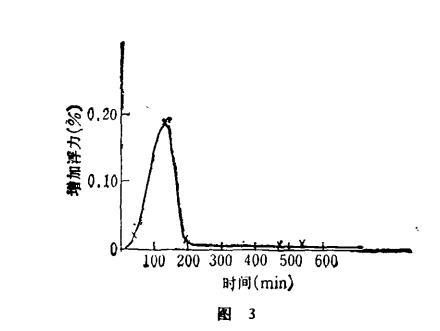 测试条件:水流速v=0.745m/s;水温T=18.0±0.3℃;电场频率3.5MHz;用长春市自来水。测试时间为1984年9月21日。电水的浮力和时间关系见图3。