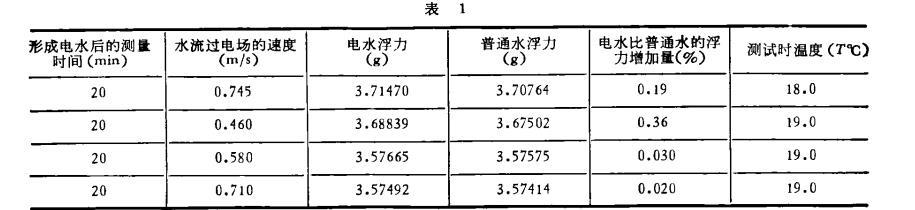 用自制电水器形成电水,用精度为0.1mg的电光天平测定电水和普通水的浮力。实验用水是长春市自来水和深井水,测试时只要保证水温和环境温度稳定,数百次实验证实,电水浮力比普通水浮力增加,重复性规律较好。现选四组数据列于表1。