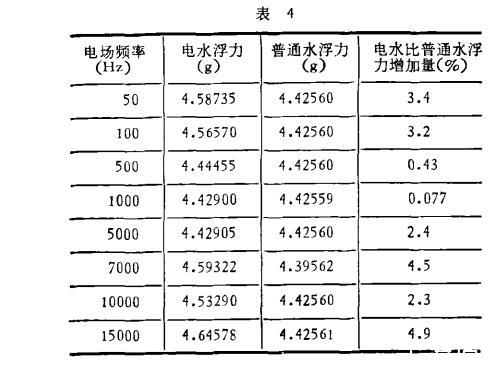 实验用的振荡稳压源是上海华东电子仪器厂制造的,输出功率75W,该电源的电压在实验时保持300V、600V和700V三个数值。改变频率从0到15kHz,水流过电场的速度为0.16m/s,水温12.0±0.3℃,用长春市自来水和地下深井水。电水形成后20分钟开始测浮力。测试时间为1984年10月18日到1984年10月21日,重复性实验进行六次,曲线都带有极值。表4是在电压600V下的一组数据。