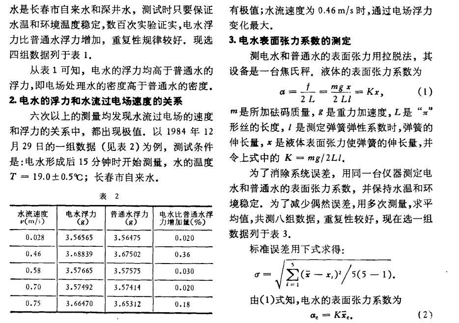 六次以上的测量均发现水流过电场的速度和浮力的关系中,都出现极值。以1984年12月29日的一组数据(见表2)为例,测试条件是:电水形成后15分钟时开始测量,水的温度T=19.0±0.5℃;长春市自来水。