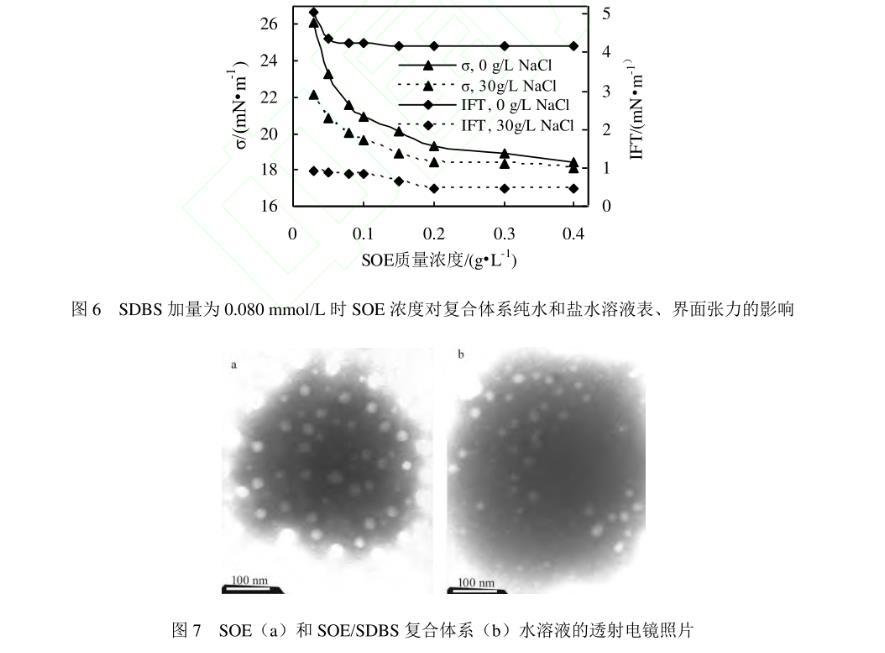测试发现十二烷基苯磺酸钠(SDBS)在纯水溶液中的ccmc为0.5 mmol/L(0.174 g/L),该浓度下溶液的表、界面张力分别为27.06 mN/m和0.18 mN/m;SDBS在30 g/L NaCl溶液中的ccmc为0.080 mmol/L(0.028 g/L),该浓度下溶液的表、界面张力分别为27.62 mN/m和0.21 mN/m。因此,选择与SOE复合的SDBS的浓度为0.08 mmol/L。