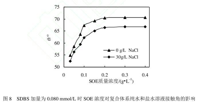 SDBS浓度为0.080 mmol/L时,SOE浓度对复合体系纯水和盐水(30 g/L NaCl)溶液接触角的影响如图8所示。单组分SDBS在浓度为0.080 mmol/L时,纯水和盐水溶液的接触角分别为45.53°和42.74°,均低于水的接触角48.33°,说明SDBS溶液与OP-10的润湿性行为相似,其在砂岩表面的水相润湿性更强,这也与SOE的润湿性行为相反。对于复合体系,在SOE质量浓度为0.2 g/L时,纯水和盐水溶液的接触角分别为70.42°和66.42°。测试发现,0.228 g/L SDBS盐水溶液的接触角为30.86°,在总用量相同的条件下,SOE/SDBS复合体系盐水溶液的水相非润湿性强得多。0.228 g/L SOE盐水溶液的接触角为71.81°,与之相比,复合体系的接触角降低了5.39°。另外,0.080 mmol/L SDBS的加入使0.2 g/L单组分SOE盐水溶液的接触角(70.32°)略微降低,但界面活性显著增强。