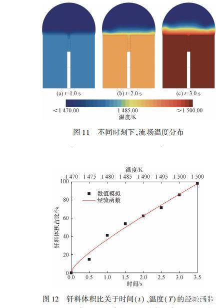 图11给出了不同时刻下的流场温度分布。不同时刻下的钎料顶端的温度场几乎没有变化,这是因为外部计算区域内充满空气,钎料与空气之间的热效率远低于钎料和母材之间,故空气对钎料的温度控制影响是微乎其微的。钎料底部温度随着母材升温迅速上升,由于相变潜热的存在,使得上方钎料温度分布始终保持在熔点以下(1470.0K)。