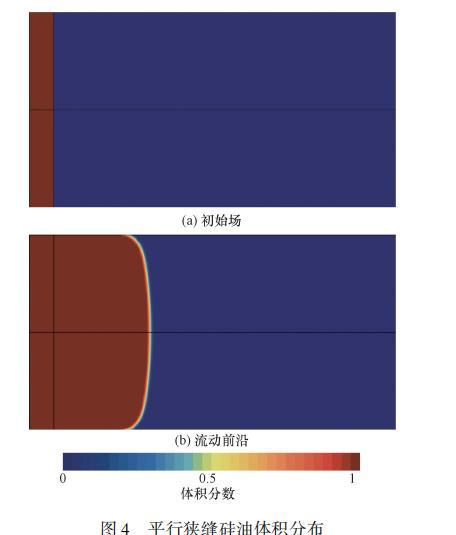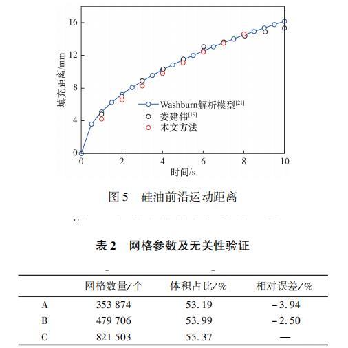根据式(6)与式(7)可以看出,这类由表面张力驱动的流动与边界处接触角紧密相关。为保证接触角施加方法的正确性,对表面张力驱动下的平行平板流动进行了计算,并将结果与前人的数值模拟结果进行了对比。验证模型为15mm×8mm×0.4mm的平行平板,所采用材料为硅油,具体物性参数如表1所示。首先将平板前端部分区域内充满硅油,以此为初始场进行计算[图4(a)]。图4(b)为计算一段时间后得到的流动前沿,最终得到的前沿最大高度随时间变化如图5所示,计算结果与前人数值模拟结果及Washburn解析模型吻合良好,证明了基于VOF模型的数值方法计算硅油填充平板过程的准确性。