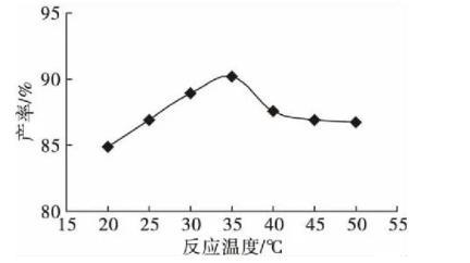 由图3可以看出,随着反应温度逐步升高产物产率也逐步增大,在35℃时产物产率达到最大值,之后反应温度再升高产物产率逐步下降。因此,选择反应温度30~40℃进行优化试验。