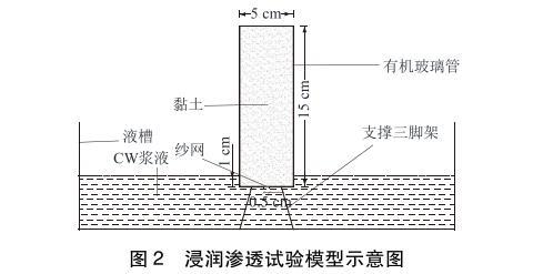 浸润渗透试验模型如图2所示,主要由液槽、支撑三脚架和透明有机玻璃管组成。有机玻璃管直径5cm,高15cm,顶端敞开,底部封闭钻有直径0.5cm的进浆孔。试验时将黏土装入有机玻璃管中,振捣压实,底部开孔处垫有纱网,防止土体掉落。将有机玻璃管和支撑三脚架放入浆液槽内,有机玻璃管底部浸入浆液液面以下1.0cm,使浆液从底部渗入黏土中,通过观察浆液在不同时间的渗透高度来评价浆液的浸润渗透效果。