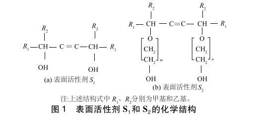 •炔属二醇表面活性剂(S1、S2),其临界胶束浓度(CMC)为0.1%,化学结构如图1所示,美国气体化学公司生产;