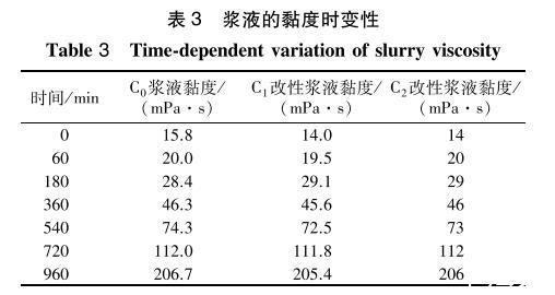 3种浆液在23℃条件下黏度随时间变化关系见表3。可以看出:3种浆液的黏度均随时间的增长而逐渐变大,表面活性剂对浆液的初始黏度以及不同时间的黏度影响很小(最大变化≤1.8mPa·s)。说明加入表面活性剂对浆液的黏度变化无影响。