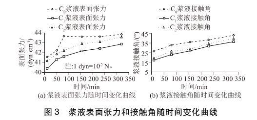 将配制好的C0、C1、C2 3种浆液每隔一定时间取样进行表面张力和接触角的测试。测得表面张力随时间变化曲线见图3(a),接触角随时间变化曲线见图3(b)。