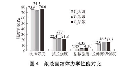 3种浆液固结体力学性能对比见图4。由图4可以看出:3种浆液固结体抗压强度和抗拉强度数值差别不大,说明表面活性剂对浆液固结体的抗压强度和抗拉强度无影响。但C1、C2浆液的粘接强度和拉伸剪切强度明显高于C0浆液的粘接强度和拉伸剪切强度。其中C1浆液的粘接强度和拉伸剪切强度比C0浆液分别提高了23.6%和37.5%;C2浆液的粘接强度和拉伸剪切强度比C0浆液分别提高了22.2%和29.2%。其原因在于表面活性剂的加入降低了浆液的接触角,使浆液有更好的浸润性和润湿性,从而提高了浆液的粘接强度和拉伸剪切强度。