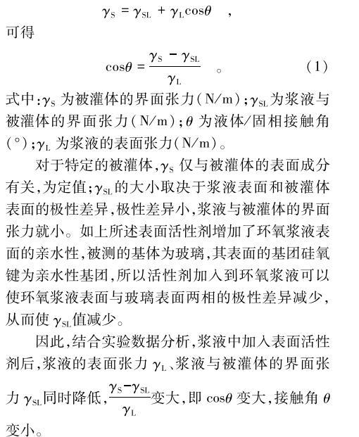 对于特定的被灌体,γS仅与被灌体的表面成分有关,为定值;γSL的大小取决于浆液表面和被灌体表面的极性差异,极性差异小,浆液与被灌体的界面张力就小。如上所述表面活性剂增加了环氧浆液表面的亲水性,被测的基体为玻璃,其表面的基团硅氧键为亲水性基团,所以活性剂加入到环氧浆液可以使环氧浆液表面与玻璃表面两相的极性差异减少,从而使γSL值减少。
