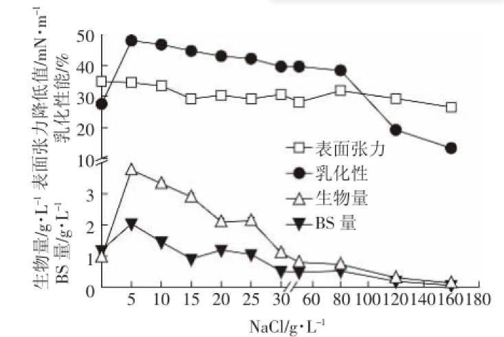 NaCl浓度通过改变细胞渗透压影响微生物的生长与代谢,从而影响发酵产物的产量。由图6可见,盐浓度在0~5 g·L-1之间,细菌生长受到促进,而当盐浓度大于5 g·L-1时,细菌的生长受到抑制,糖脂量与生物量趋势一致。菌株的生物量、生物表面活性剂量、表面张力值与乳化性均在盐浓度为5 g·L-1时呈现最大,说明该菌株具有一定的耐盐性,与强婧等研究的生物表面活性剂产生菌Pseudomonas aeruginosa S6也能够耐盐相似。此外,本菌株在最高为25 g·L-1的盐浓度条件下依然能够存活,但此时已不能产生更多的生物表面活性剂。