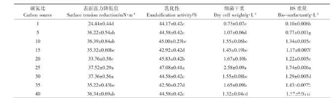 表5碳氮比对147细菌生长以及生物表面活性剂产量的影响