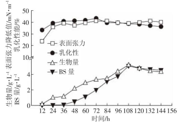 在上述花生油25 mL·L-1为碳源、硫酸铵1 g·L-1为氮源、NaCl浓度为5 g·L-1、pH=8、温度保持为30℃的最佳培养条件下,追踪细菌147的发酵动态(图7)。菌株经过短暂的延滞期后进入对数生长期,108 h后进入稳定增长期,此时菌体所产生的生物表面活性剂含量达到最大,此后生物表面活性剂含量减少,可能是因为后期培养基内的碳源已经用尽,细菌开始以胞外分泌物糖脂为碳源维持生命。而表面张力值与乳化性在24 h后达到最大,之后维持在稳定水平,说明细菌在24 h后产生的生物表面活性剂已到达生物表面活性剂的临界胶束浓度,此后生物表面活性剂产量还会增加,但是表面张力降低值与乳化性只维持在一定范围内波动。
