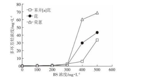 图8是水相中多环芳烃(苯并[a]芘、芘、荧蒽)的表观溶解度随着生物表面活性剂浓度的变化曲线,当生物表面活性剂浓度大于300 mg·L-1时,各多环芳烃的浓度随生物表面活性剂浓度增大而增大。这是由于生物表面活性剂在CMC(临界胶束浓度)以上时会形成胶束,而胶束内的疏水性微环境对疏水性有机溶剂具有较强的分配作用,可显著增大溶质的表观溶解度[40];当生物表面活性剂浓度低于CMC时,生物表面活性剂分子以单体形式存在,单分子的表面活性剂对被增溶物的分配作用很弱,因而各多环芳烃在水中的溶解度变化不大或者轻微增加。